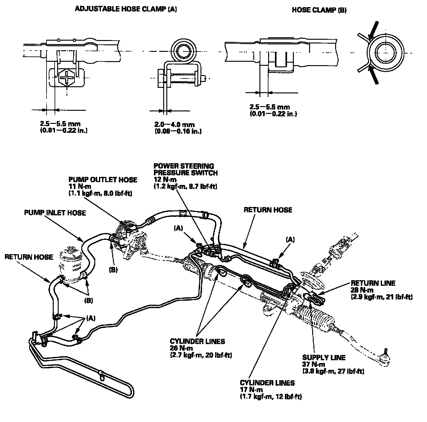 - Connect each hose to the corresponding line securely until it contacts the stop on the line. Install the clamp or adjustable clamp at the specified distance from the hose end as shown.