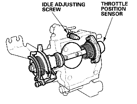 The throttle body is a single-barrel side draft type. The lower portion of the throttle valve is heated by engine coolant from the cylinder head. The idle adjusting screw, which increases/decreases bypass air, is located on top of the throttle body.