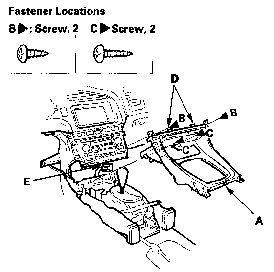 1. Carefully insert a flat-tip screwdriver next to the clip (B), and detach the clips by prying on the driver's seat heater switch (C) and passenger's seat heater switch (D). Take care not to scratch the console panel tray.