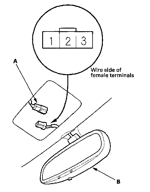 2. Disconnect the 3P connector (A) from the automatic inside dimming mirror (B).