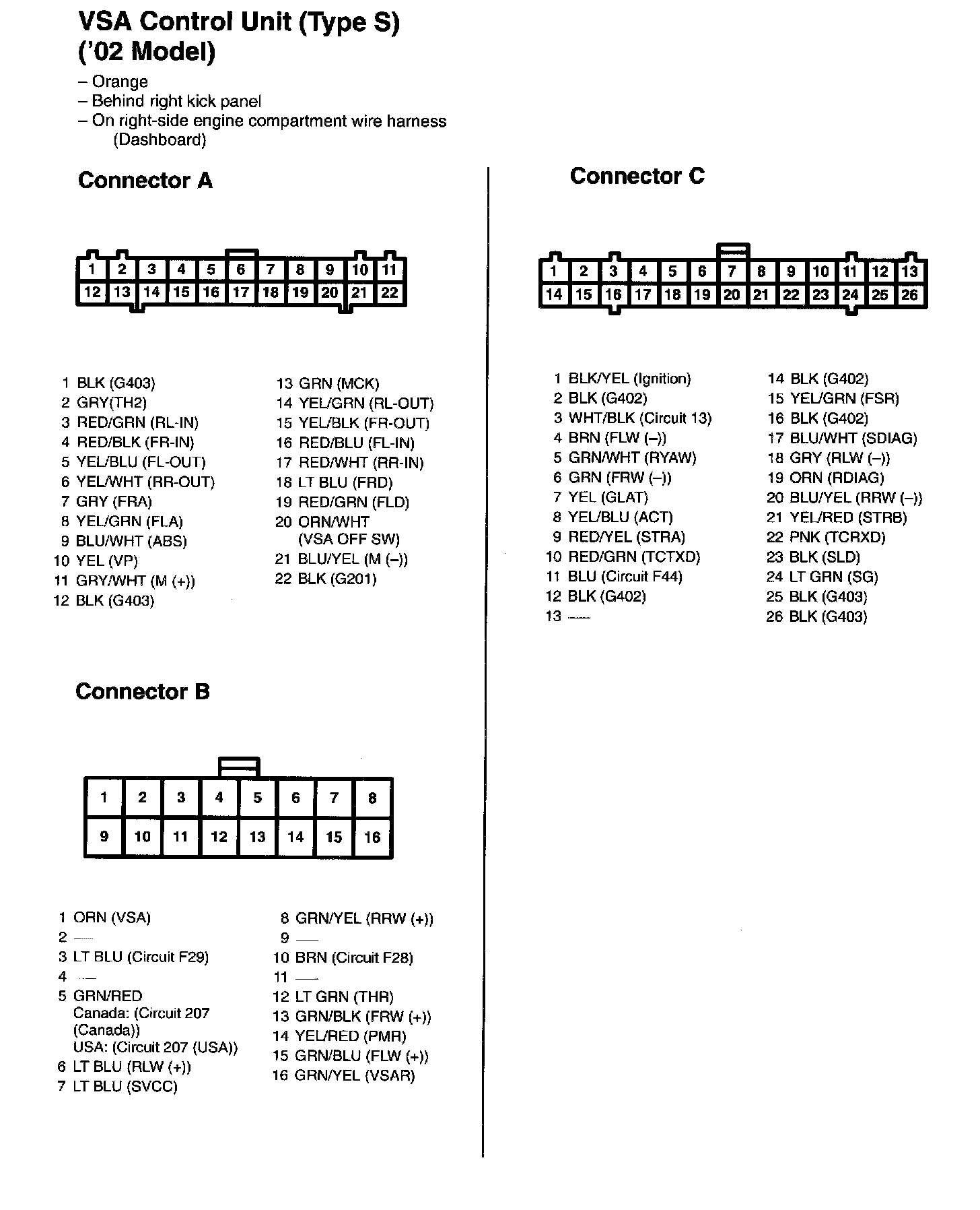 VSA Control Unit (Type S) Connectors A - C: