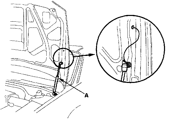 1. Remove the support struts (A) from the engine hood. Move the hood to a vertical position, then reinstall the support strut as shown.