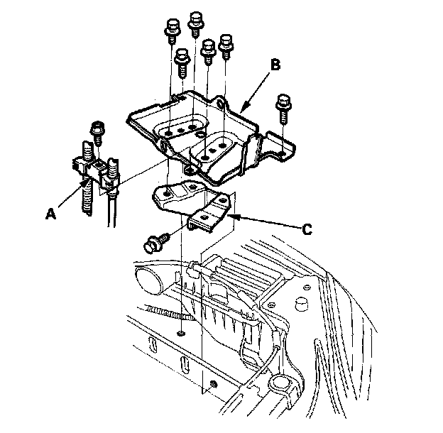 42. Remove the bolts (A) securing the shift cable holder (B), then remove the shift cable cover (C). To prevent damage to the control lever joint, be sure to remove the bolts securing the shift cable holder before removing the bolts securing the shift cable cover.