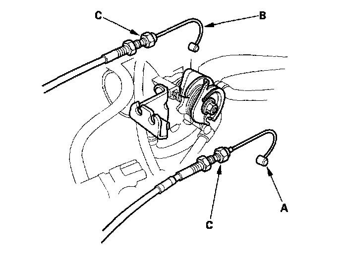 13. Remove the throttle cable (A) and cruise control cable (B) by loosening the locknuts (C), then slip the cable ends out of the accelerator linkage. Take care not to bend the cables when removing them. Always replace any kinked cable with a new one.
