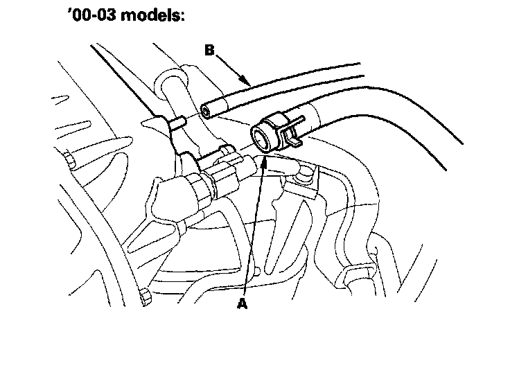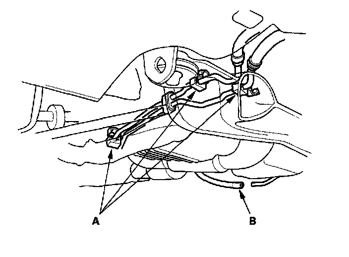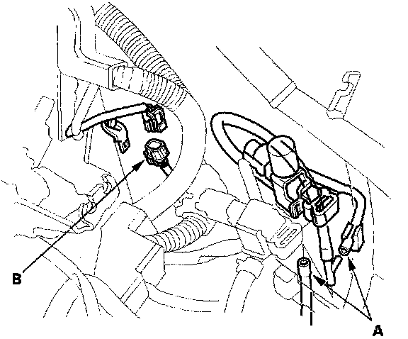 20. Remove the vacuum hoses (A), then disconnect the Primary Heated Oxygen Sensor (primary HO2S) connector (B).