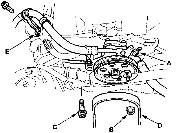 27. Loosen the adjusting nut (A), remove the locknut (B) and mounting bolt (C), then remove the Power Steering (P/S) pump belt (D) and pump without disconnecting the P/S hoses.