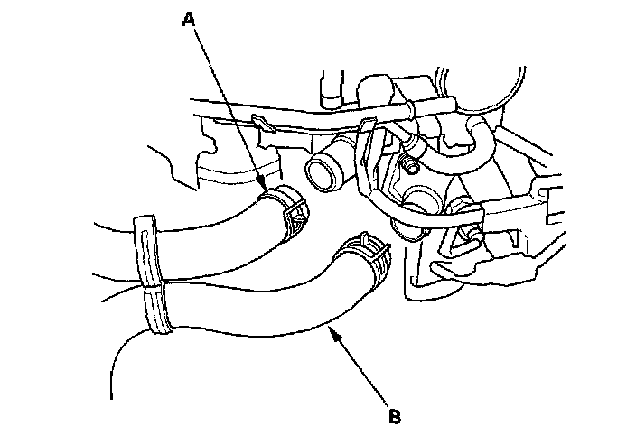 45. Lower the hoist, then remove the upper radiator hose (A), and the lower radiator hose (B).