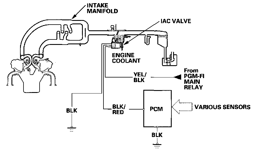 - When the engine coolant temperature is low, the IAC valve is opened to obtain the proper fast idle speed. The amount of bypassed air is thus controlled in relation to engine coolant temperature.