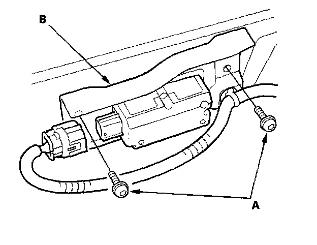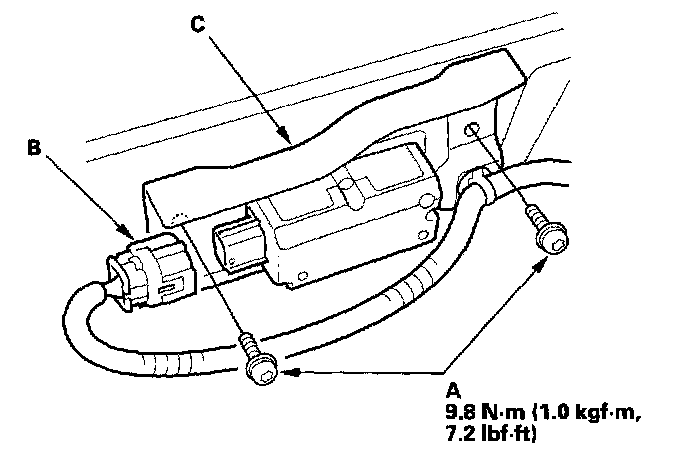 1. Install the new side impact sensor with Torx bolts (A) then connect SRS floor harness 4P connector (B) to the side impact sensor (C).