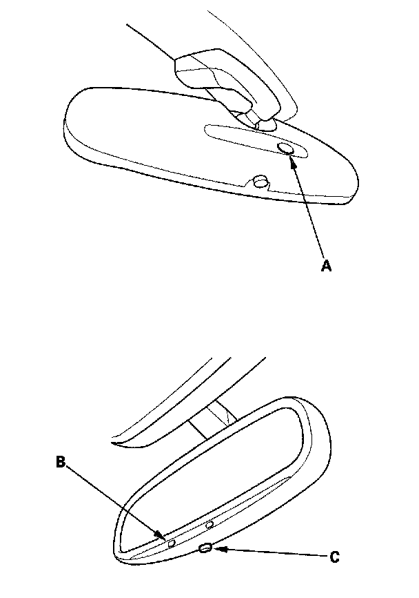 The automatic dimming inside mirror has a front-facing lux level sensor (A), a rear-facing lux level sensor (B), and a control unit. The control unit receives signals from each sensor. Based on the difference between the two lux levels (the light outside the vehicle and the light from the headlights of the other vehicle, etc.), the control unit controls the electro-chromic gel to reduce the glare. This dimming function is canceled when the transmission is in reverse, or when the automatic dimming switch (C) is turned OFF.