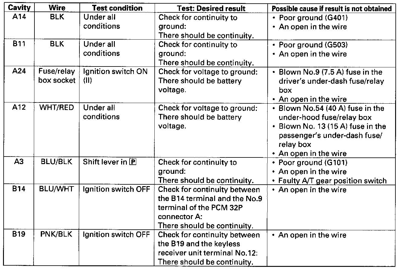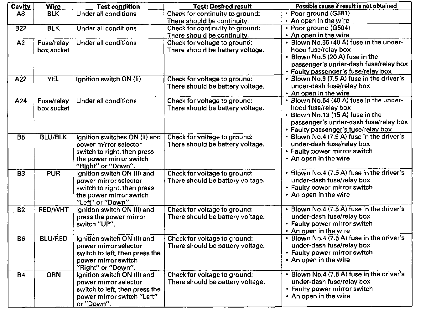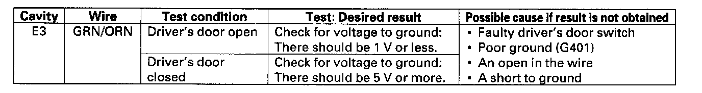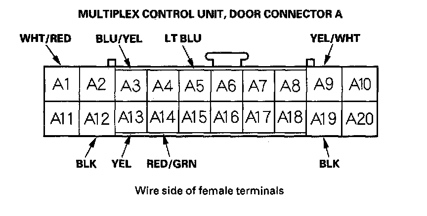 13. Reconnect the driver's multiplex control unit to the driver's under-dash fuse/relay box, and make these input tests at the appropriate connectors on the driver's under-dash fuse/relay box.