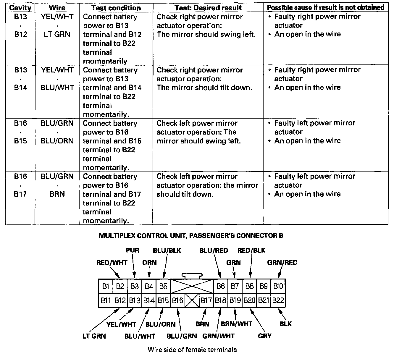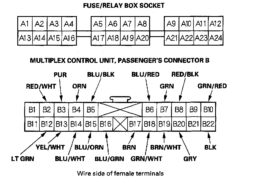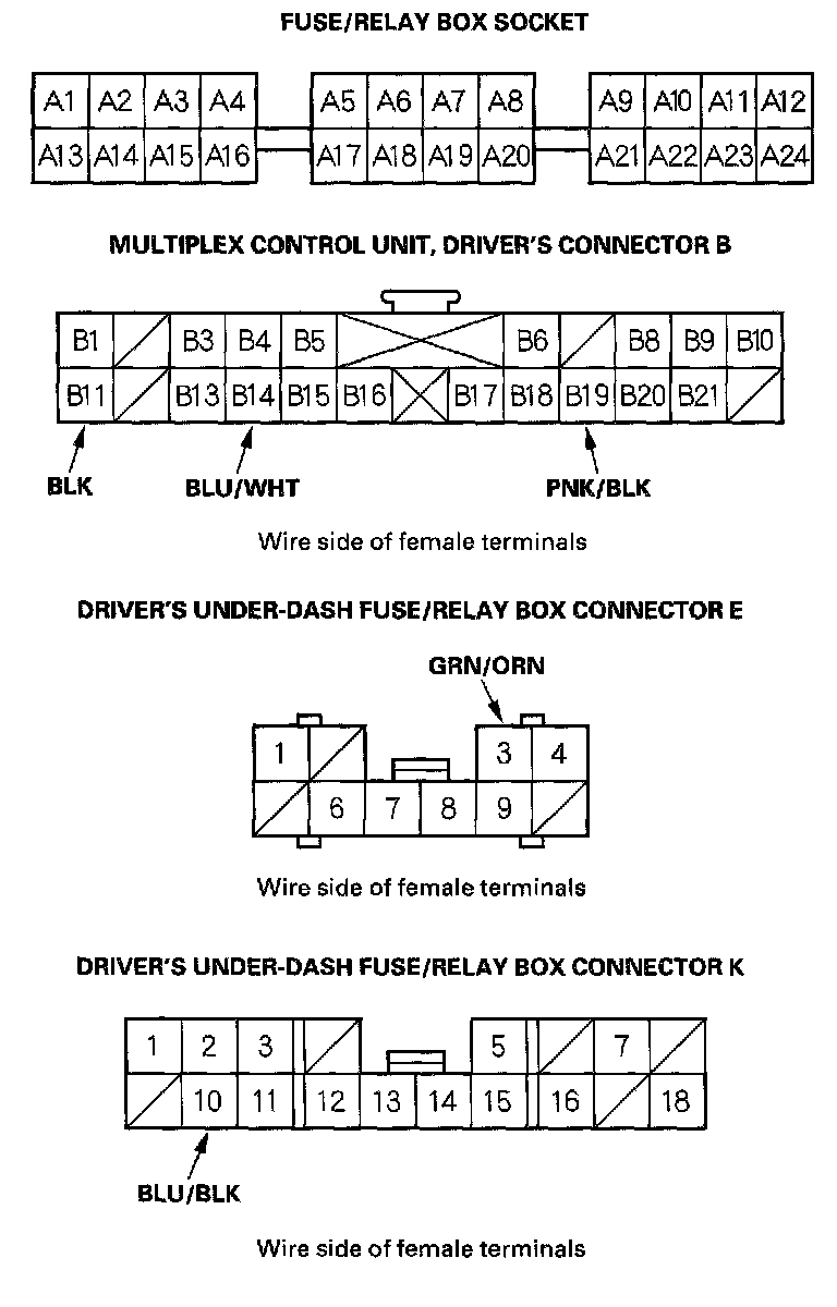 9. Reconnect the passenger's multiplex control unit to the passenger's under-dash fuse/relay box, and make these input tests at the appropriate connectors on the passenger's under-dash fuse/relay box.