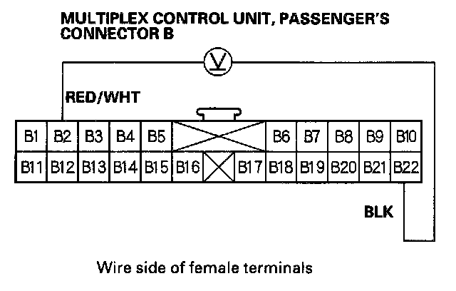 2. Check for voltage between the B2 and B22 terminals of the passenger's multiplex control unit with the power mirror switch pressed UP.