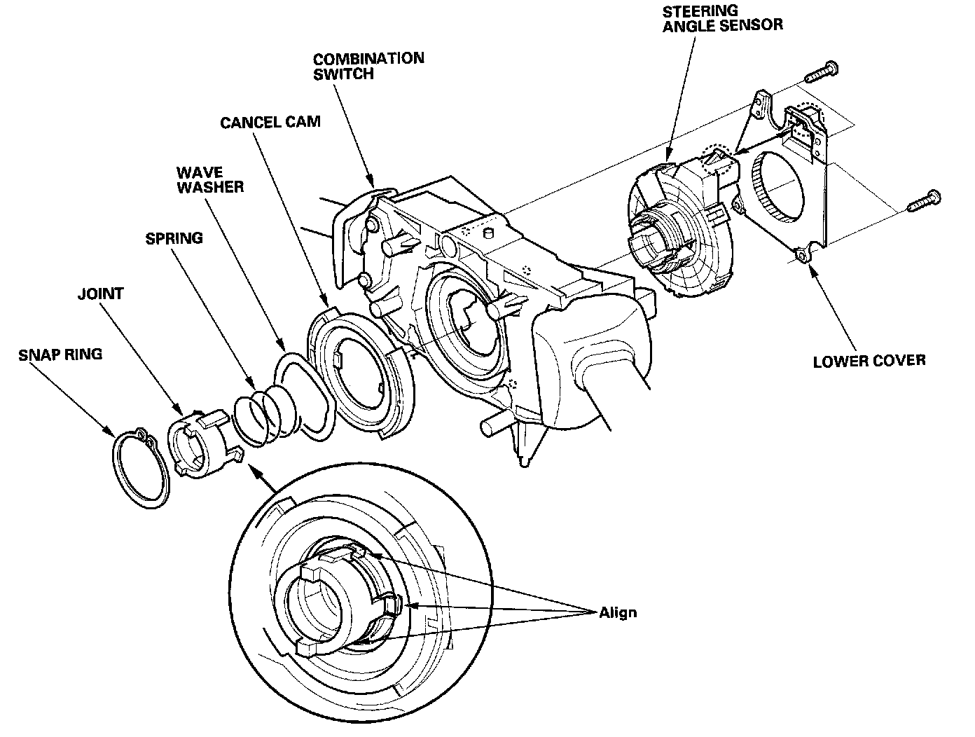 2. Remove the snap ring and screws, then remove the steering angle sensor from the combination switch.
