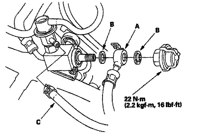 23. Install the lock bolt (B) with a new lock washer (C), then bend the lock tab of the lock washer (A/T).