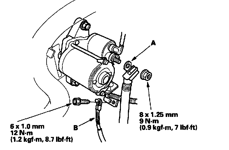 15. Tighten the rear mount support bolt (A) and rear engine damper mounting bolts (B) (M/T).