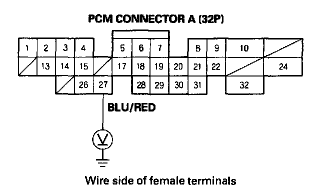 10. Using a Backprobe Set, measure the voltage between the No. 27 terminal of PCM connector A (32P) and body ground with the PCM connectors connected.