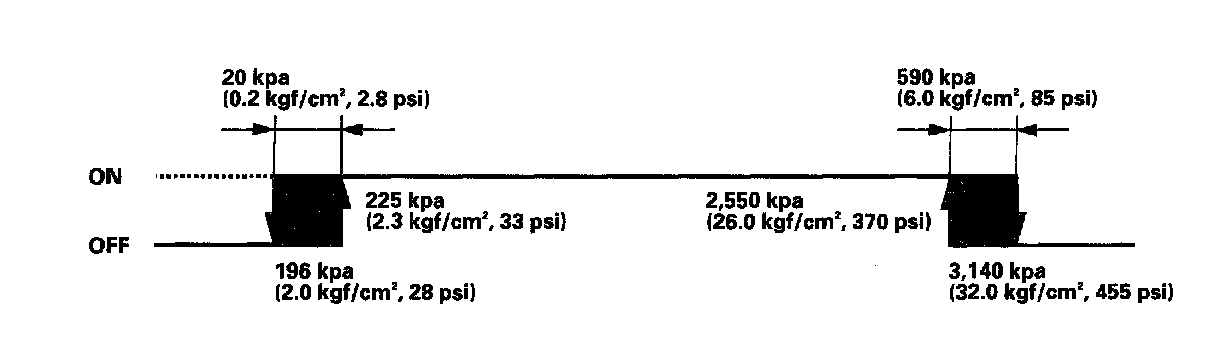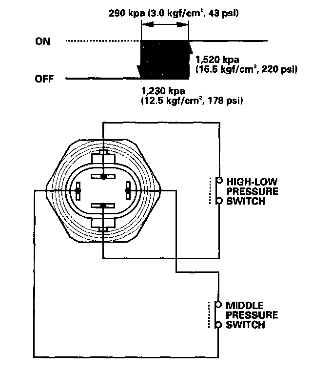 If the refrigerant pressure goes above or below 1,520 kPa (15.5 kgf/sq.cm, 220 psi), the A/C pressure switch sends a signal to the climate control unit to change the speed of the condenser fan and radiator fan (High-Low).