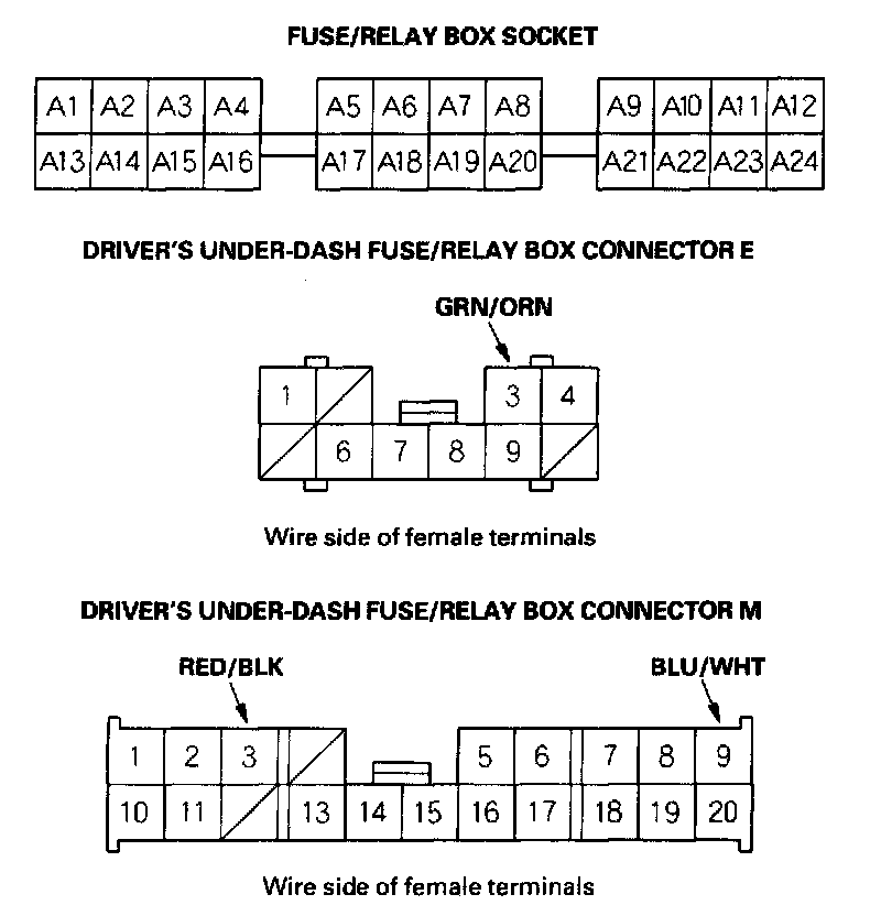 5. Reconnect the driver's multiplex control unit to the driver's under-dash fuse/relay box, and perform the following input tests at the appropriate connectors on the back of the driver's under-dash fuse/relay box. For driver's under-dash fuse/relay box connector socket location.