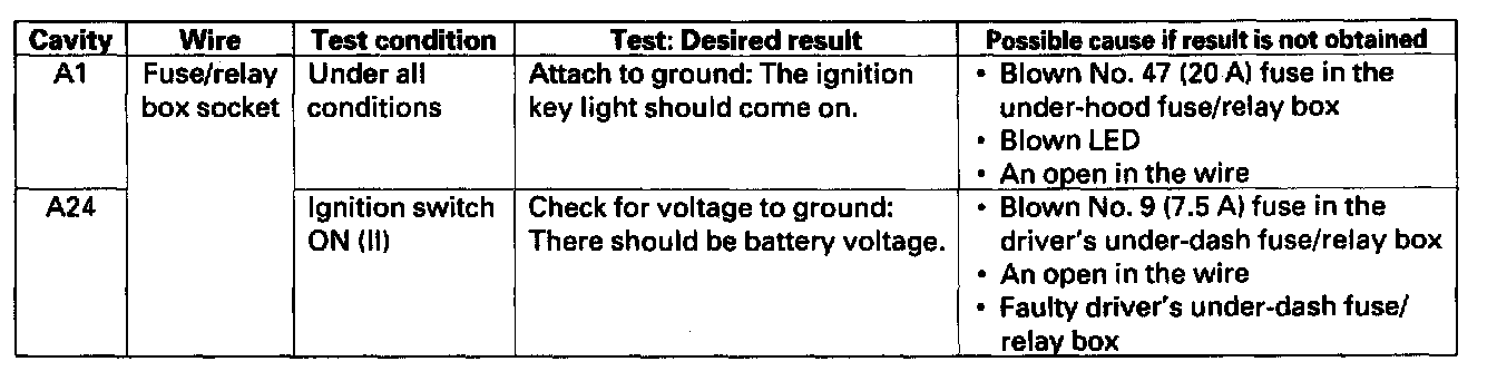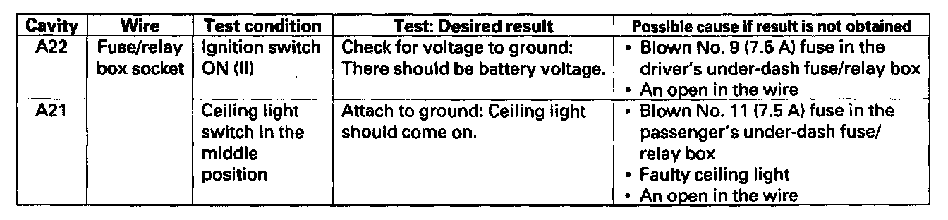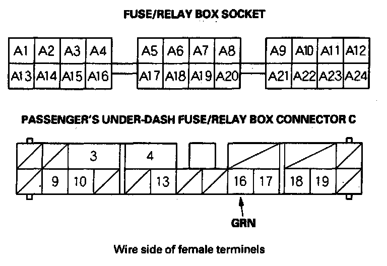 8. With the passenger's multiplex control unit still disconnected, make these input tests at the connector and passenger's under-dash fuse/relay box socket.
