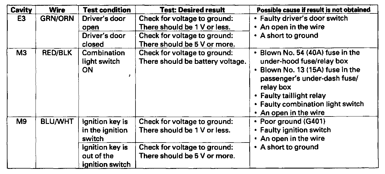 9. Reconnect the passenger's multiplex control unit to the passenger's under-dash fuse/relay box, and perform the following input tests at the appropriate connectors on the back of the passenger's under-dash fuse/relay box.