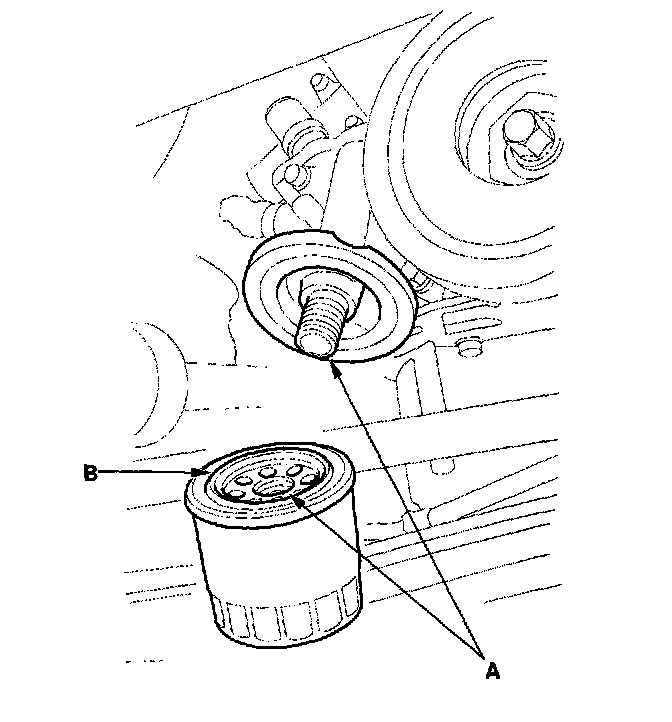 2. Inspect the threads (A) and rubber seal (B) on the new filter. Wipe off the seat on the engine block, then apply a light coat of oil to the filter rubber seal. Use only filters with a built-in bypass system.