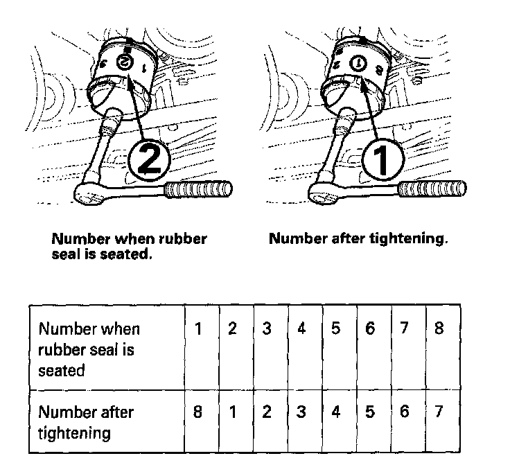 ^ Tighten the filter by turning it clockwise seven numbers from the one you noted. For example, if number 2 is at the bottom when the seal is lightly seated, tighten the filter until the number 1 comes around to the bottom.