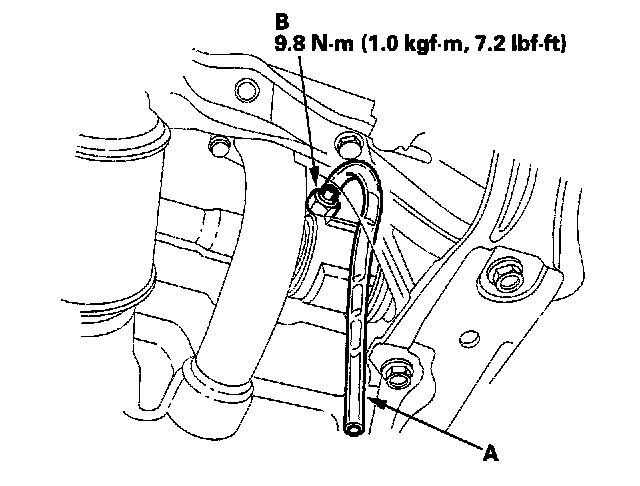 4. Install a rubber hose (A) on the drain bolt (B) located at the rear of the cylinder block, then loosen the drain bolt.