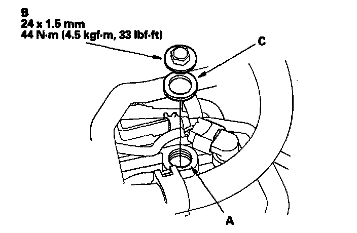 6. Install the ATF filler bolt (B) with a new sealing washer (C).