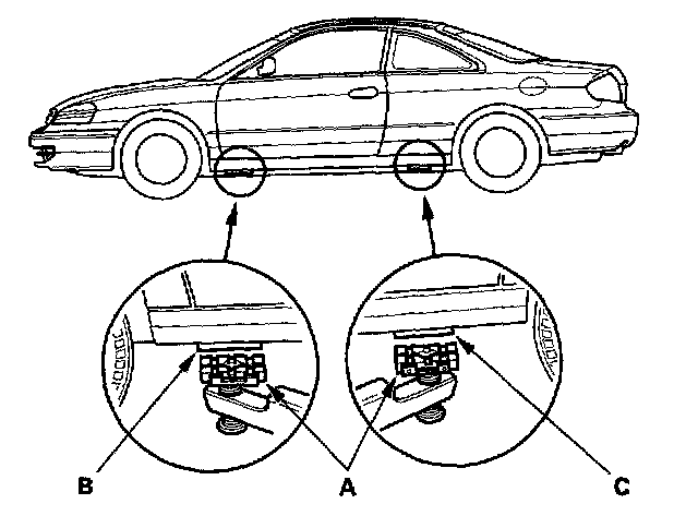 1. Position the hoist lift blocks (A), or safety stands, under the vehicle's front support points (B) and rear support points (C).