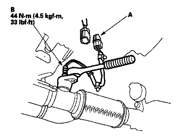 1. Disconnect the primary HO2S 4P connector (A), then remove the primary HO2S (B).