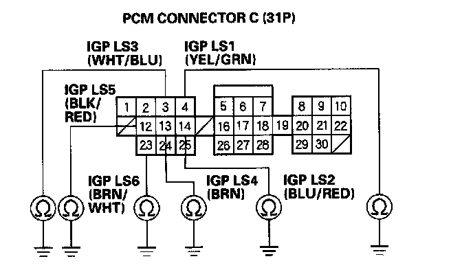 7. Check for continuity between the body ground and PCM connector terminals C3, C4, C12, C13, C14, and/or C23 individually.