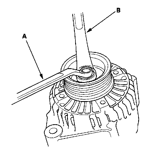 3. If the front bearing needs replacing, remove the pulley locknut with a 10 mm wrench (A) and a 22 mm wrench (B). If necessary, use an impact wrench.