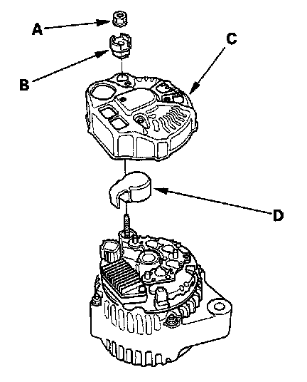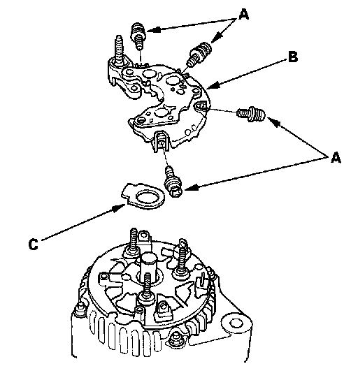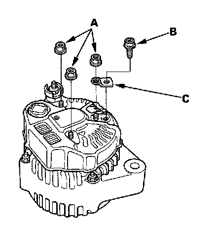 4. Remove the three flange nuts (A) and the screw (B) from the alternator, then remove the plate terminal (C).