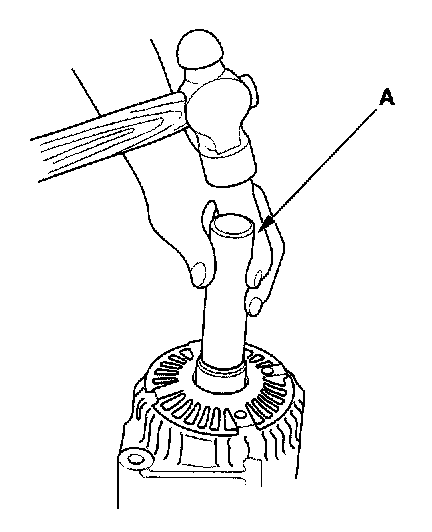 16. Support the stator housing in a vise, and drive out the front bearing with a brass drift (A) and hammer.