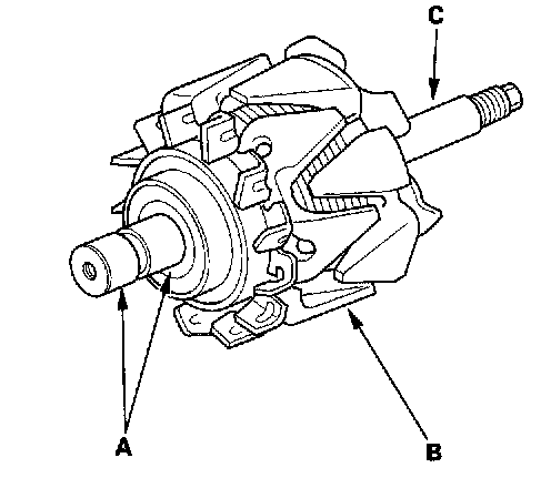 21. Check that there is no continuity between each slip ring and the rotor (B) and the rotor shaft (C).