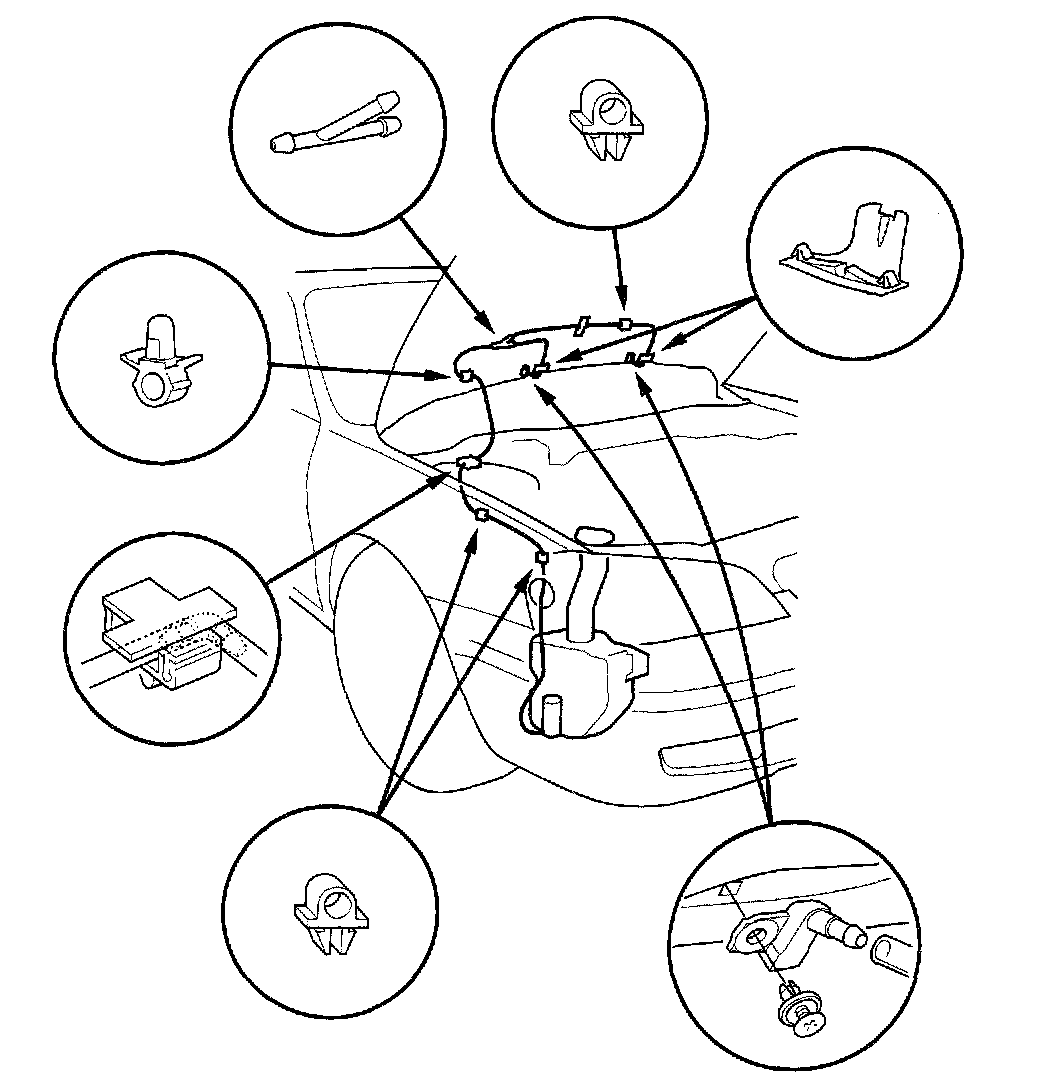 2. Remove the windshield washer nozzles and clips, then remove the tube.