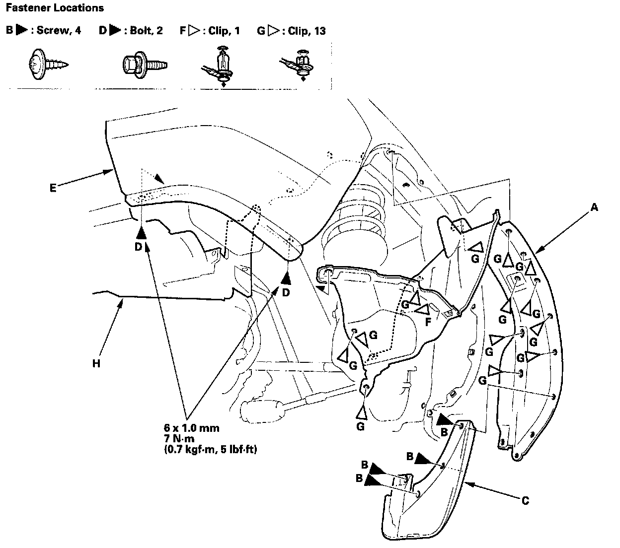 3. Remove the clips (F, G) securing the front inner fender (and splash shield (H)) on the body.