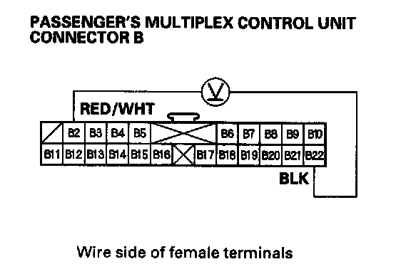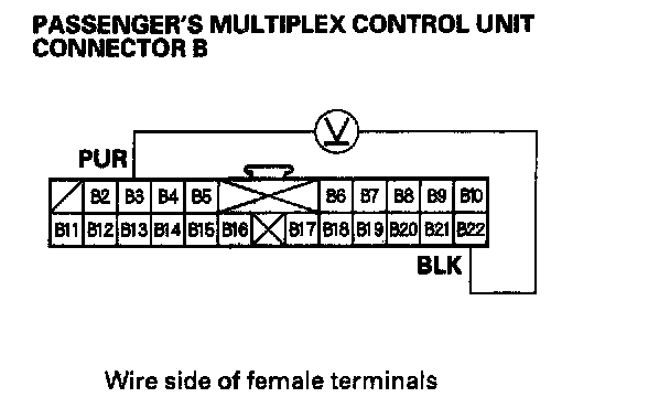 2. Check for voltage between the B2 and B22 terminals of the passenger's multiplex control unit with the power mirror switch pressed UP or Left.