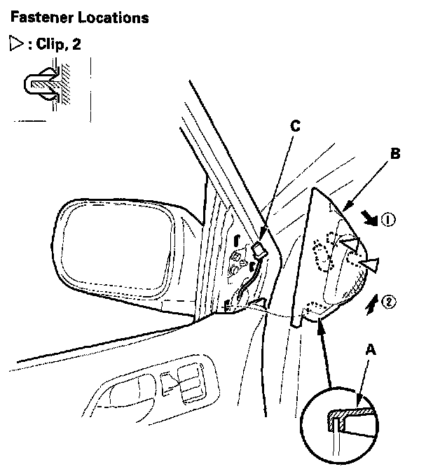 2. Carefully detach the clips and release the hook (A), then pry out the mirror mount cover (B) by hand in the sequence shown.