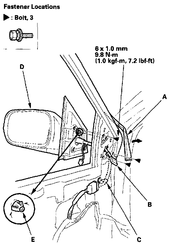 5. Pull the front door upper seal (A) as necessary, disconnect the connector (B), and detach the harness clip (C), then remove the bolts securing the mirror. While holding the mirror (D), push out the clip (E), and remove the mirror. Take care not to scratch the door.