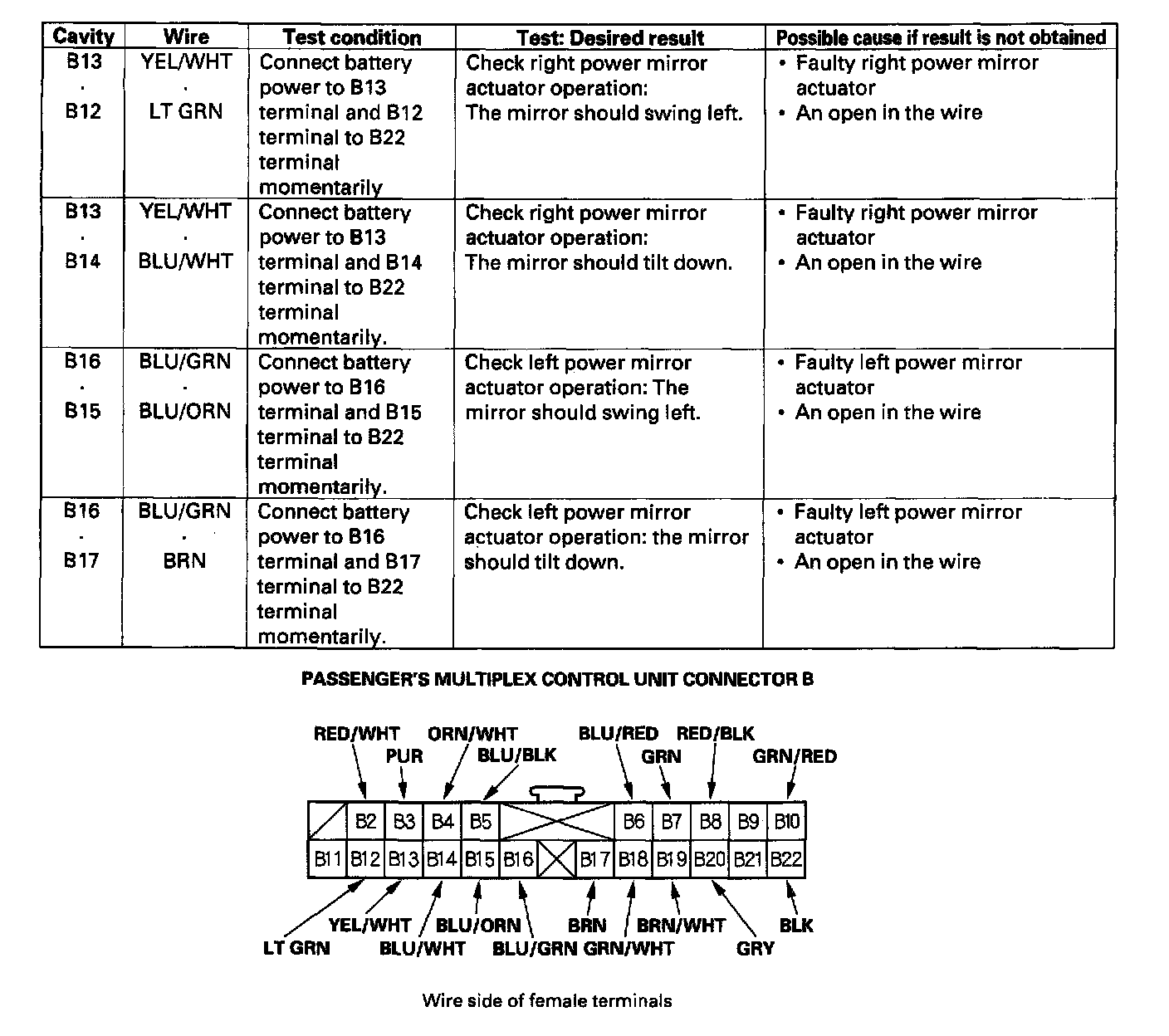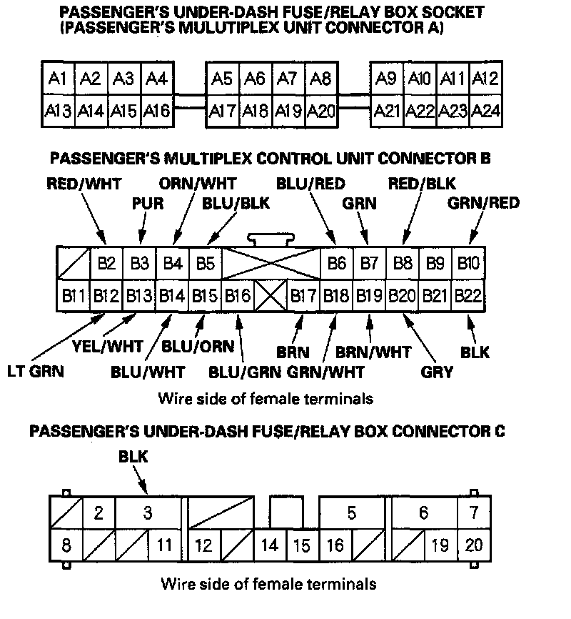 9. Reconnect the passenger's multiplex control unit to the passenger's under-dash fuse/relay box, and make these input tests at the appropriate connectors on the passenger's under-dash fuse/relay box.