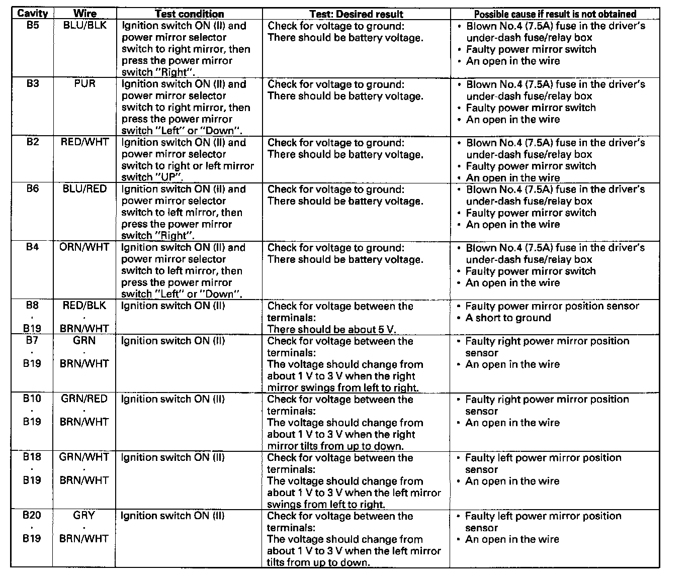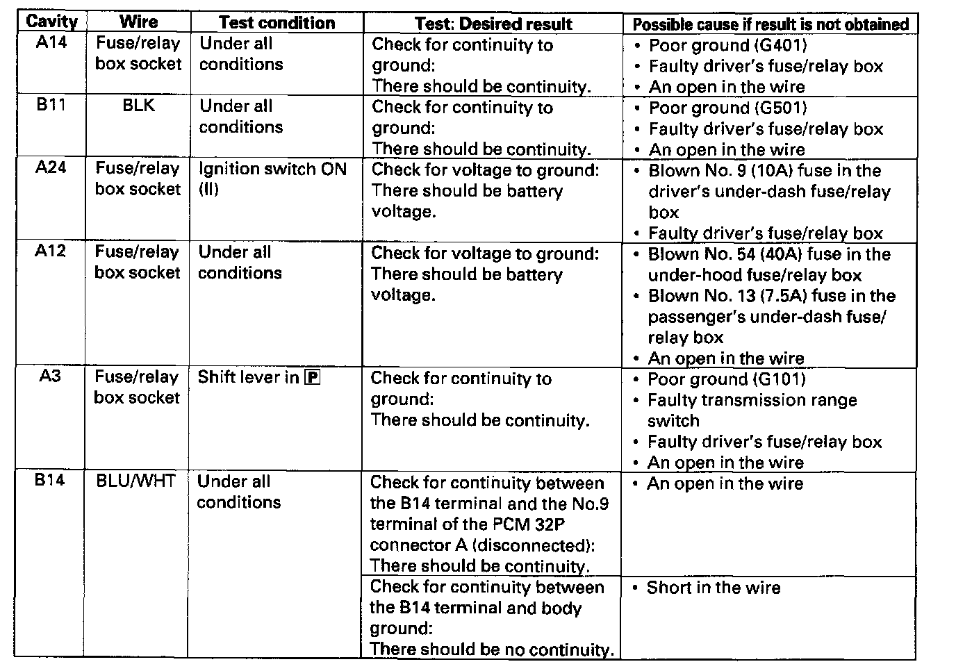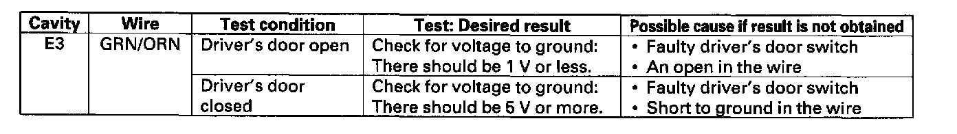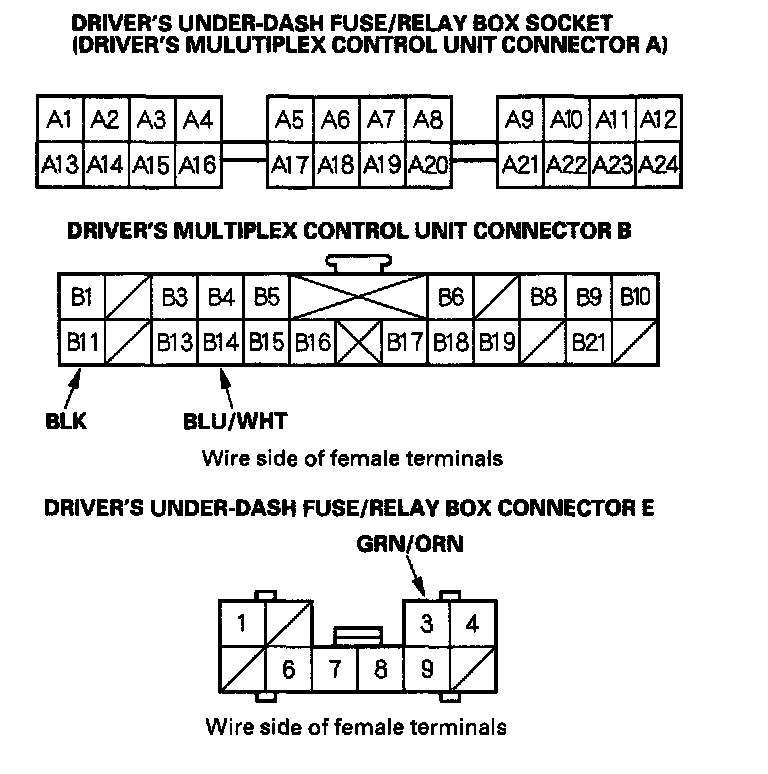 13. Reconnect the driver's multiplex control unit to the driver's under-dash fuse/relay box, and make these input tests at the appropriate connectors on the driver's under-dash fuse/relay box.