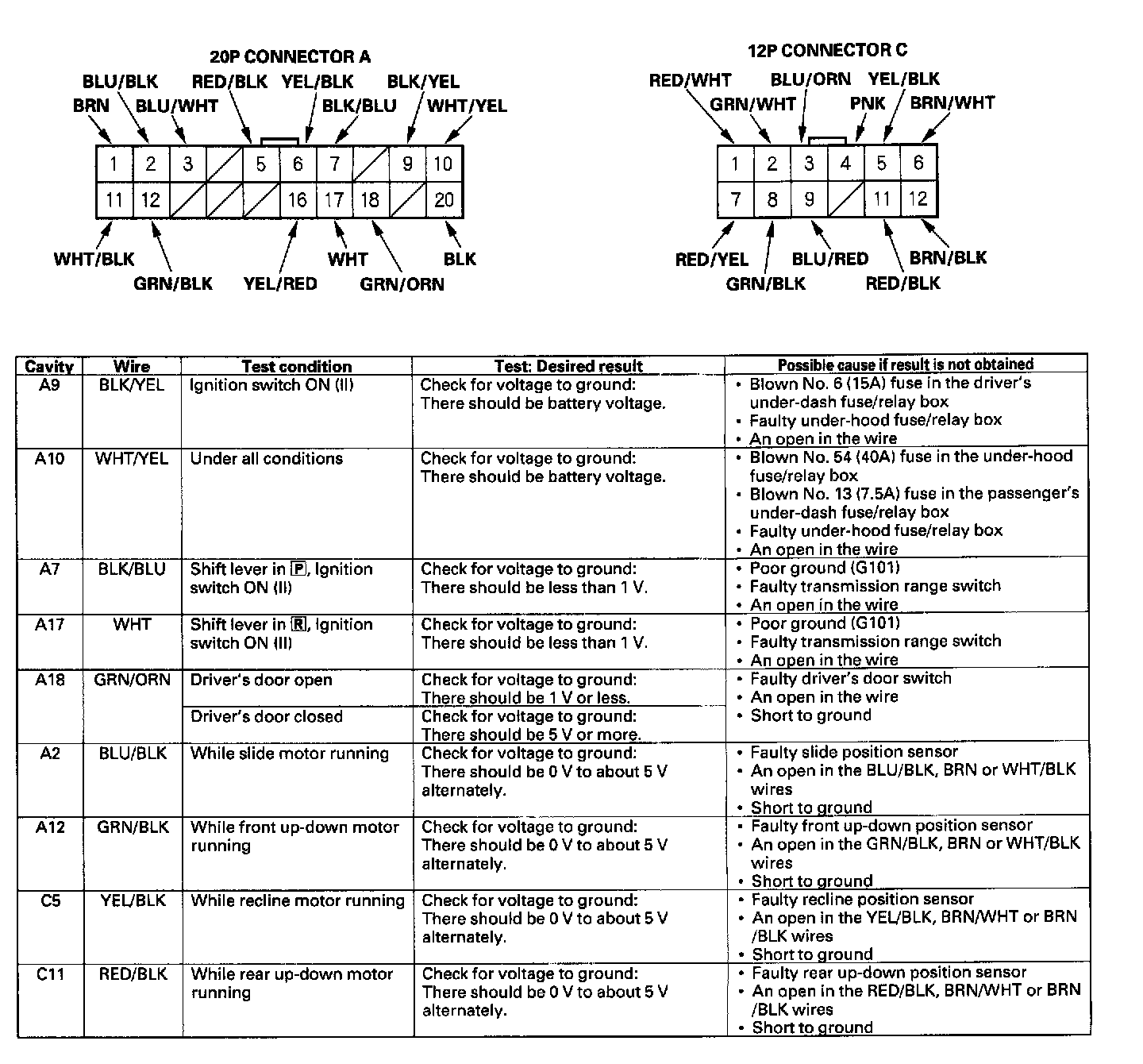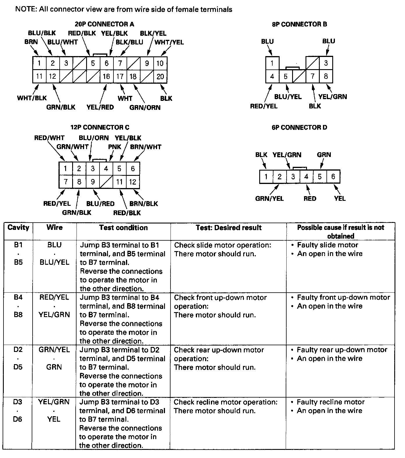 4. Reconnect the connectors to the driver's power seat control Unit, and make these input tests at the connectors.