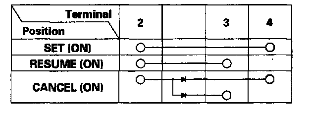 - If there is continuity and it matches the table, but switch failure was suspected after the cruise control unit input test, check and repair the wire harness or cable reel.