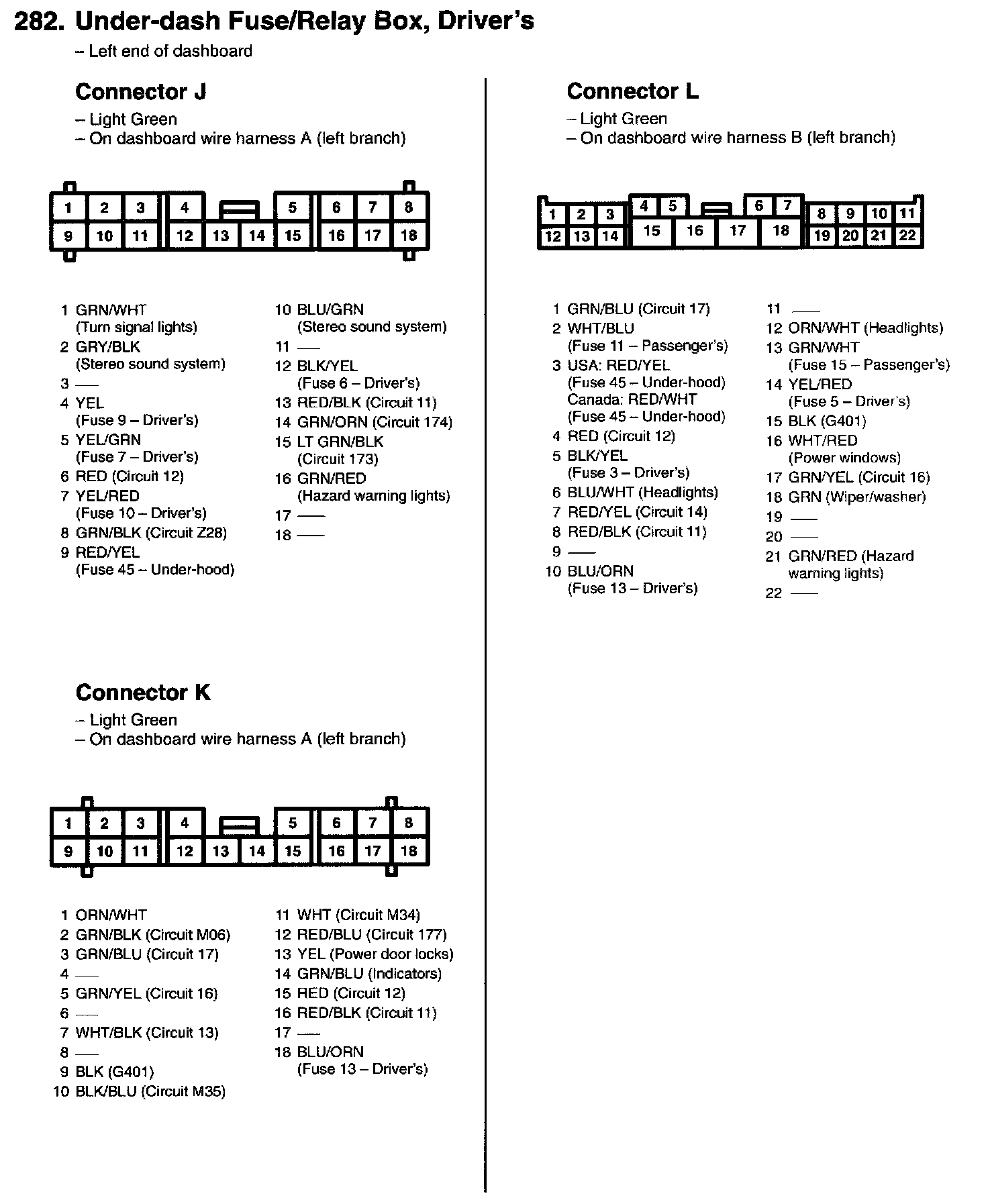 282. Under-dash Fuse/Relay Box, Driver's (Connectors J - L):