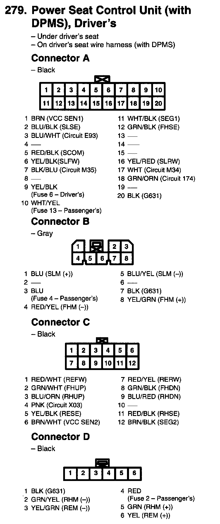279. Power Seat Control Unit (With DPMS), Driver's (Connectors A - D):