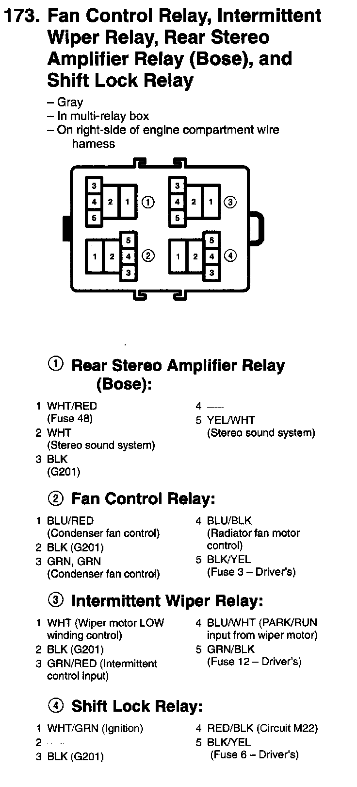 173. Fan Control Relay, Intermittent Wiper Relay, Rear Stereo Amplifier Relay (Bose), And Shift Lock Relay: