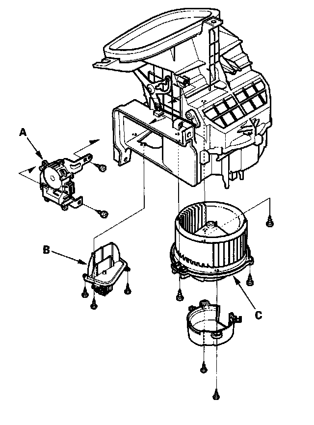 - The recirculation control motor (A), the power transistor (B) and the blower motor (C) can be replaced without removing the blower unit.