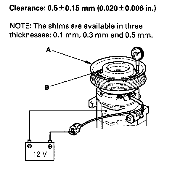 3. Measure the clearance between the pulley (A) and the pressure plate (B) with a dial indicator. Zero out the indicator, then apply battery voltage to the compressor clutch. Measure the movement of the pressure plate when the voltage is applied. If the clearance is not within the specified limits, the pressure plate must be reshimed.